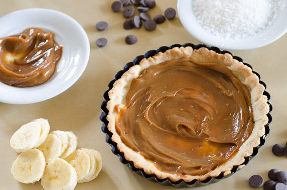 מורחים מעל הבצק שכבה נדיבה של ריבת חלב. מסדרים מעליה את הבננות בצפיפות.