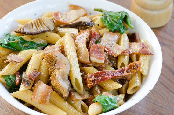 פסטה עם בייקון, פטריות מיובשות ותרד: