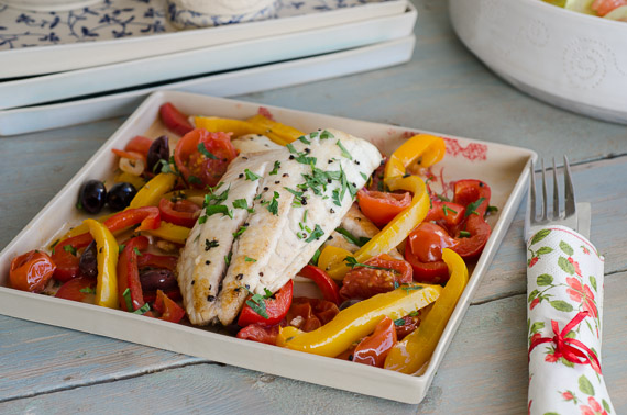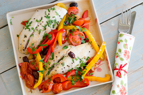 פילה דניס ביין לבן, פלפלים, עגבניות שרי וזיתים